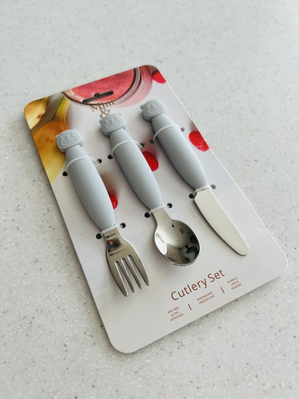 Cute & practical, our easy grip silicone & metal cutlery set is perfect for the next step in your 'mini's' self-feeding journey.