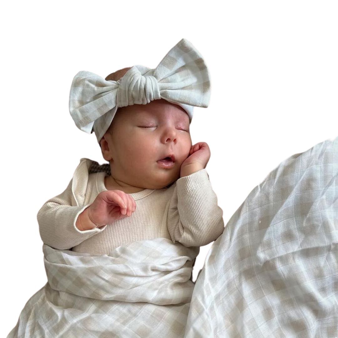 The Mini & Me Topknot Headband Nude Gingham is luxuriously soft & stretchy. Match it back with our Bamboo Muslin Swaddle or Baby Wrap Sets.